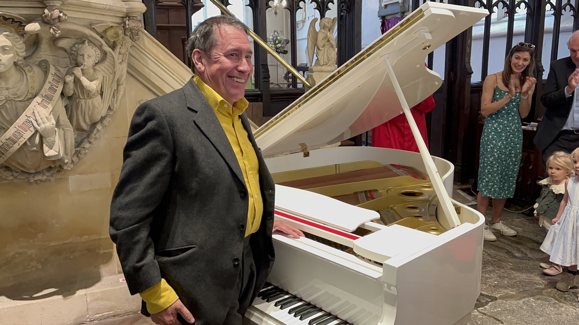 Jools Holland attended a retirement service for Reverend Edward Wright of St Georges Church in Wrotham, Kent, the same church where Jools married his wife, Christabel, in 2005.